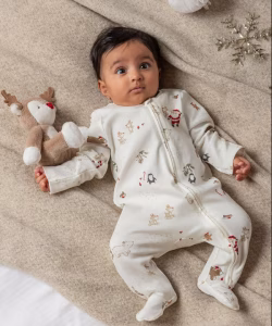 My First Christmas Sleepsuit – White zip all over print all in one.